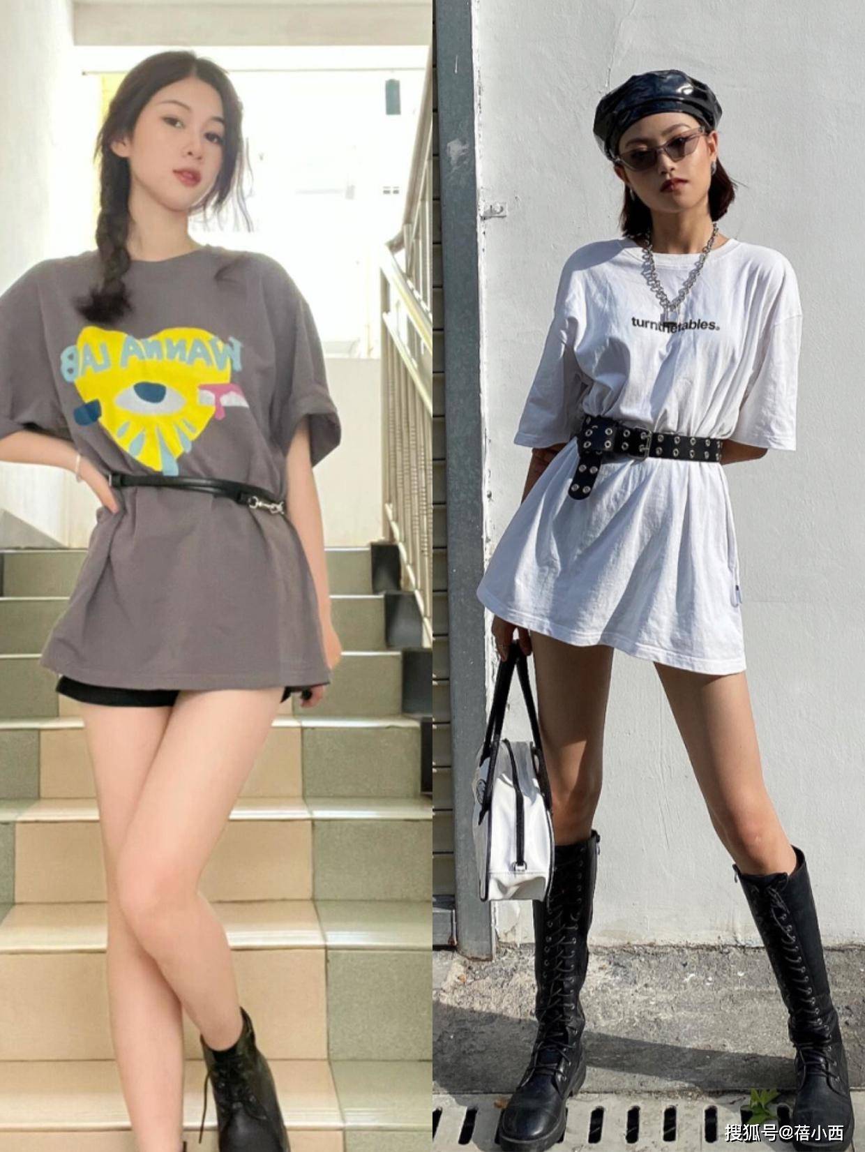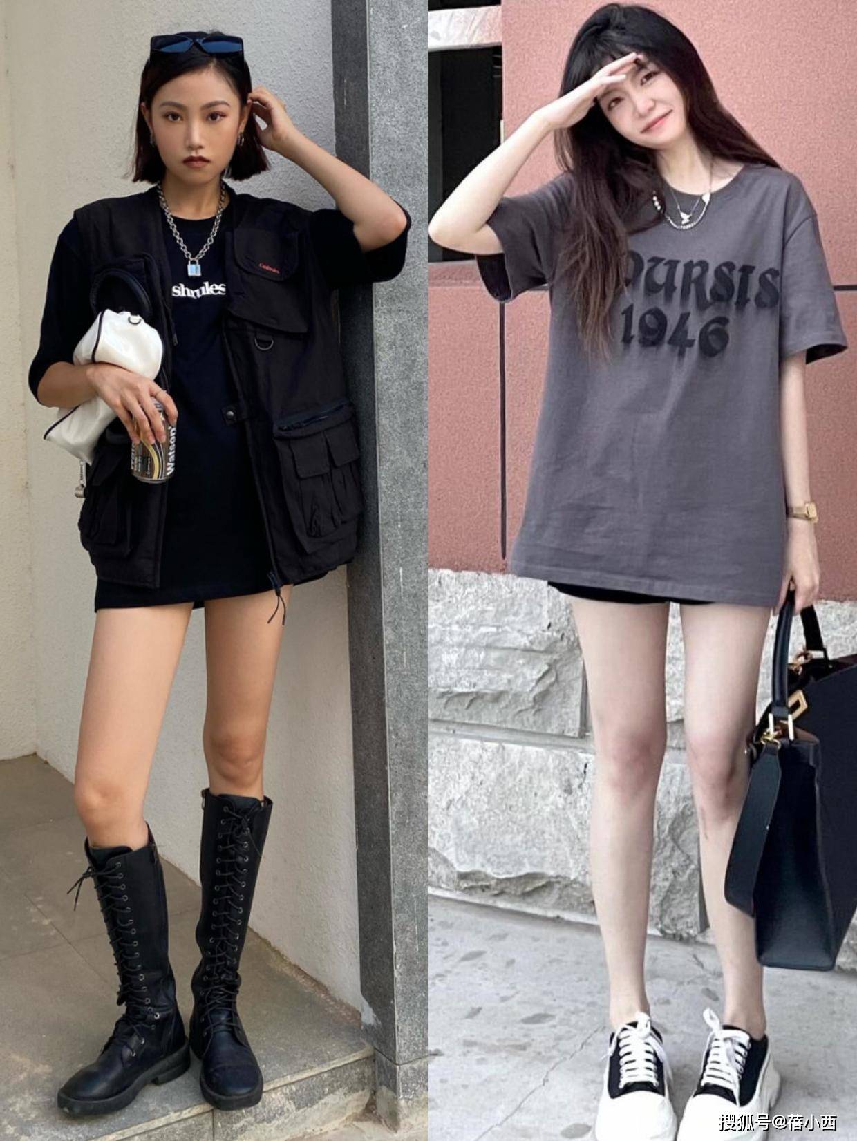 夏天是展示身材的好时机,如果你自信自己的腿部线条,为什么不大胆展示呢?尝试T恤搭配“下衣失踪”的方式,既能拉长腿部比例,又能彰显出修长的双腿。如果担心小腿线条,可以选择高筒靴来增加立体感。