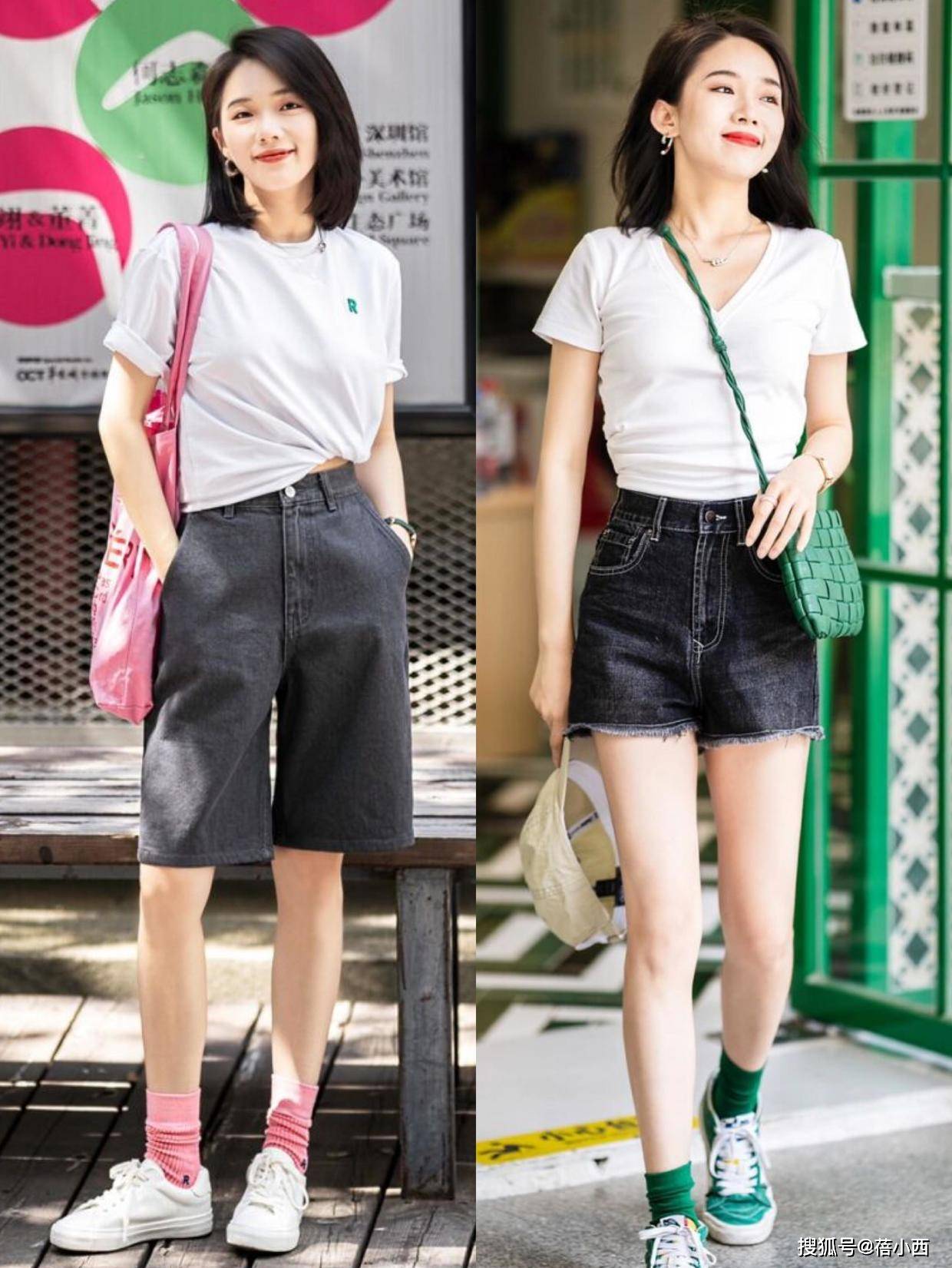 短裤搭配也是夏日必备的单品之一,特别是在高温天气下,既清凉又舒适。根据腿部线条选择合适的短裤款式,腿部线条较好的可以选择超短裤,展示完美身材;如果大腿稍微有些肉感,膝盖上方的长度会更合适。