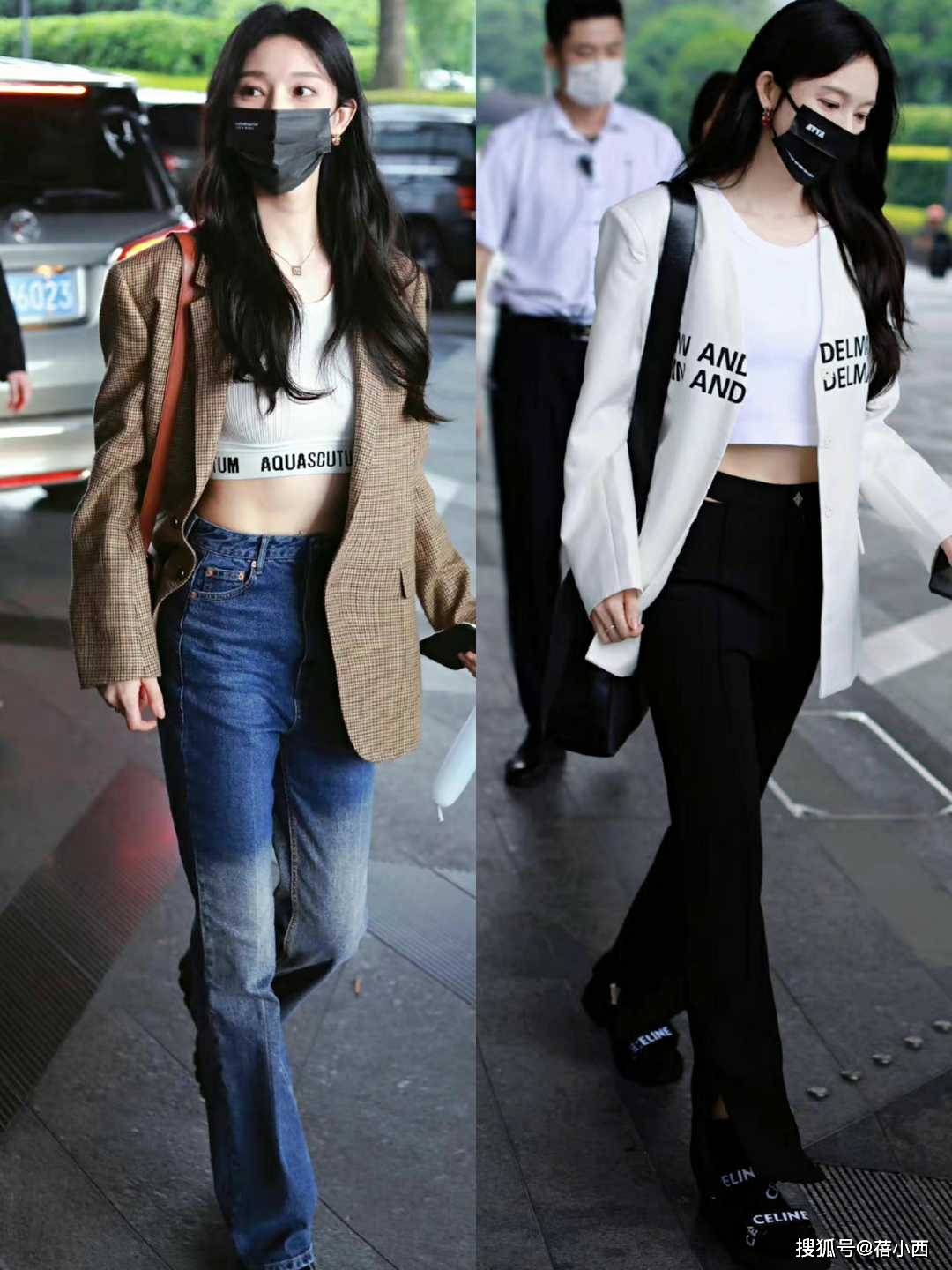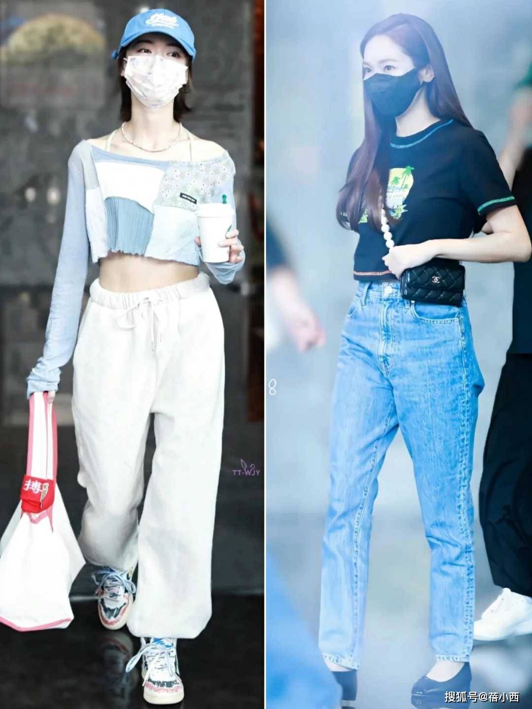 对于小个子女生来说,夏季穿上短T恤是一个很好的选择。像吴谨言和郑秀妍就穿上了露腰短T,配上高腰裤,不仅修饰了身形,还拉长了身材比例,看起来极具时尚感。