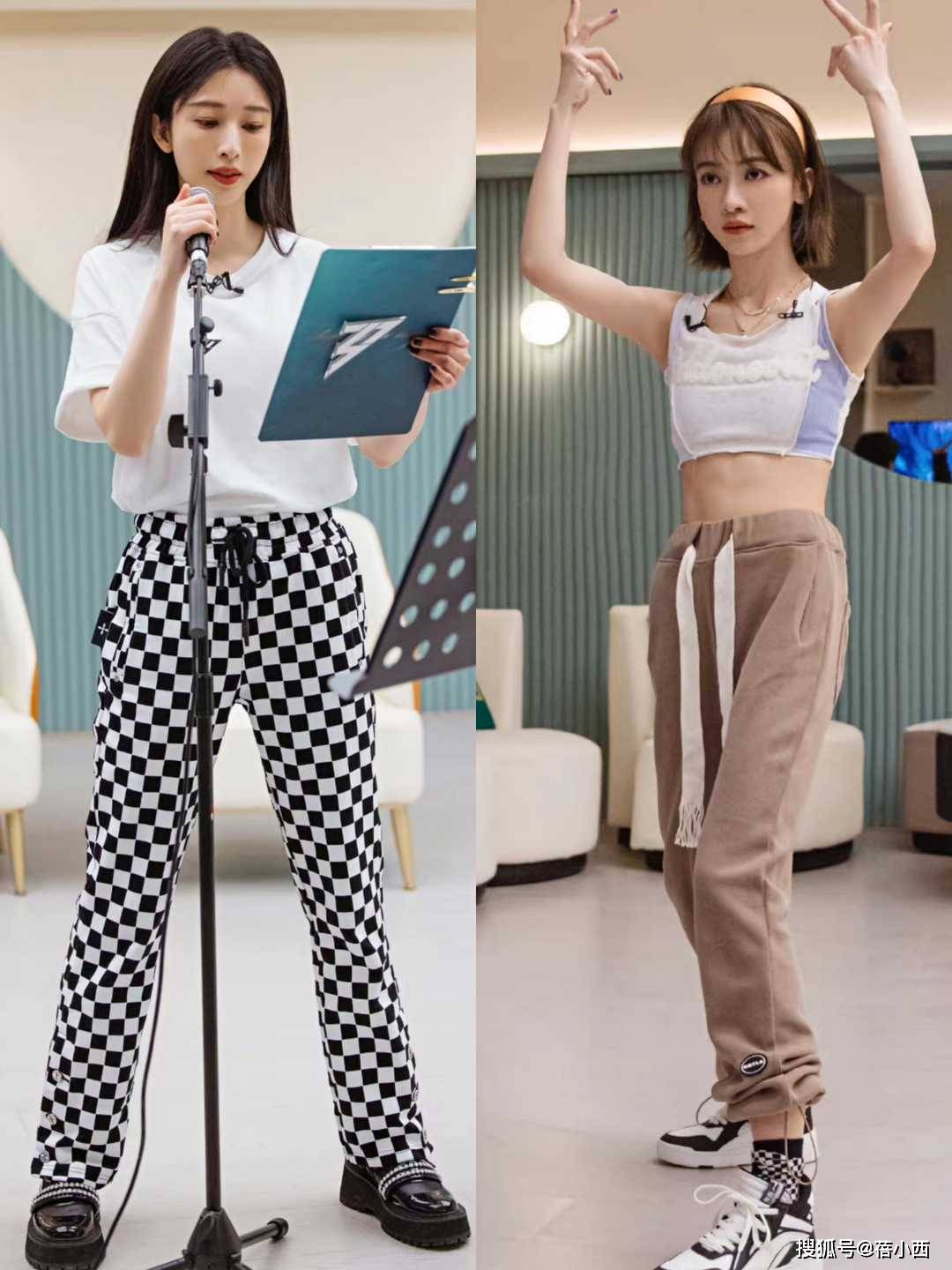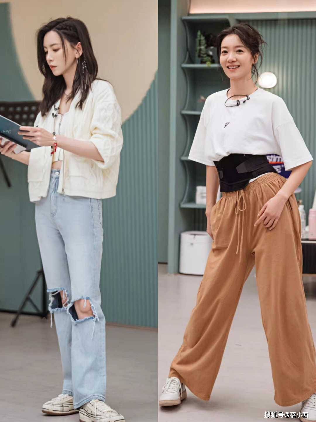 在日常排练中,姐姐们常常穿着阔腿裤,既舒适又时髦。无论是纯色的阔腿裤,还是格纹款式,都能让穿着者看起来洋气十足。像于文文选择的破洞牛仔阔腿裤,大面积的破洞设计更加时尚,搭配运动鞋,让整个人看起来既舒适又有范儿。