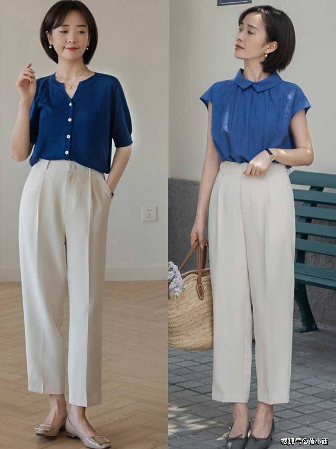 在配色上,也可以尝试撞色。例如白色或黑色阔腿裤搭配红色T恤、蓝色针织衫,都能让造型瞬间亮眼,更富层次感。
