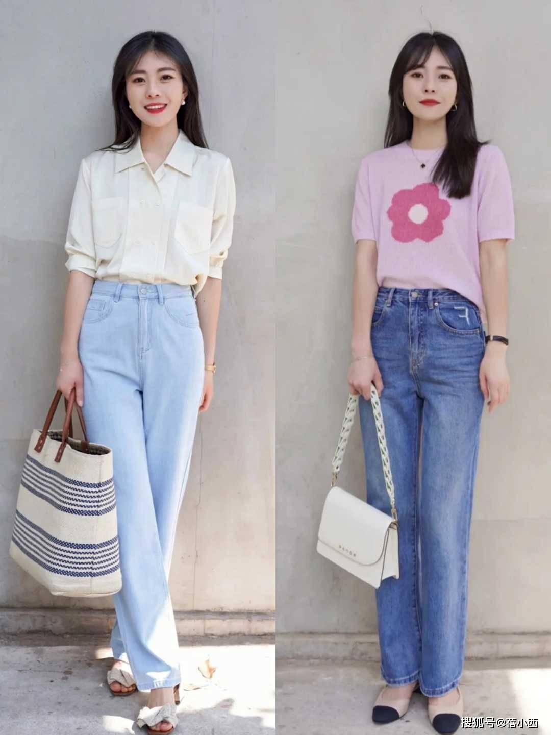 3 牛仔阔腿裤:百搭耐看,无论搭配衬衫还是T恤都不会出错,再配上休闲平底鞋或高跟鞋,既舒适又时髦。
