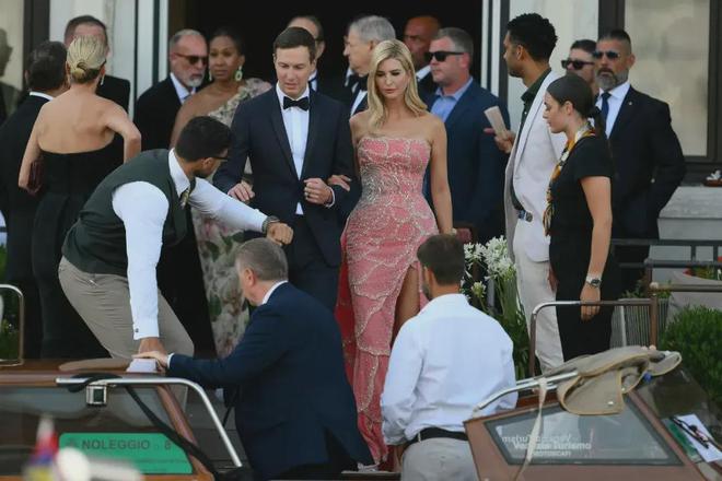 6月26日晚,一场欢迎派对在威尼斯圣母奥尔托教堂(Madonna dellOrto)旁的私人回廊举行。嘉宾们纷纷乘坐“贡多拉”抵达派对现场。出于安全考虑,当地警方在该地区部署了大量警力,整条运河都被送宾客的船只堵塞。