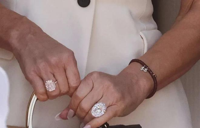 不得不说,婚礼上最吸睛的还是她的大钻戒——右手一枚250万美元的30克拉粉钻订婚戒指;左手一枚疑似珠宝商Lorraine Schwartz的椭圆形切割新婚钻戒,有专家估计在30—40克拉,估值在300万—500万美元,更大更闪,和她的LB logo新手链相得益彰。