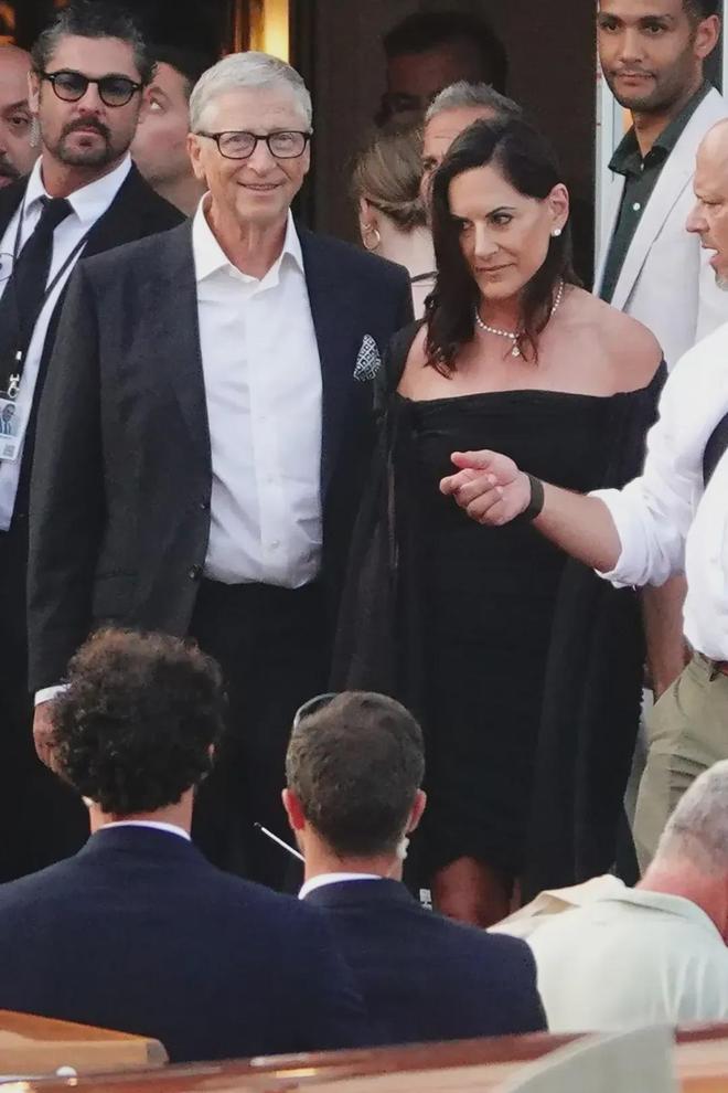 比尔·盖茨和女友保拉·赫德,都是一身黑的保守打扮。保拉身穿一件黑色露肩连衣裙,还搭配了一条闪亮的钻石项链和一对耳钉,算是比较低调了。