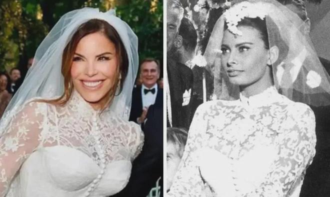 一反桑切斯过往的高调着装,这套来自杜嘉班纳的婚纱,除了尽显曲线之外,画风出人意料地“保守”。