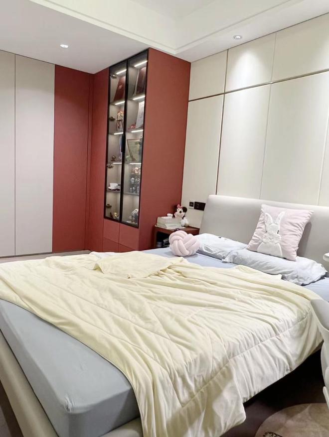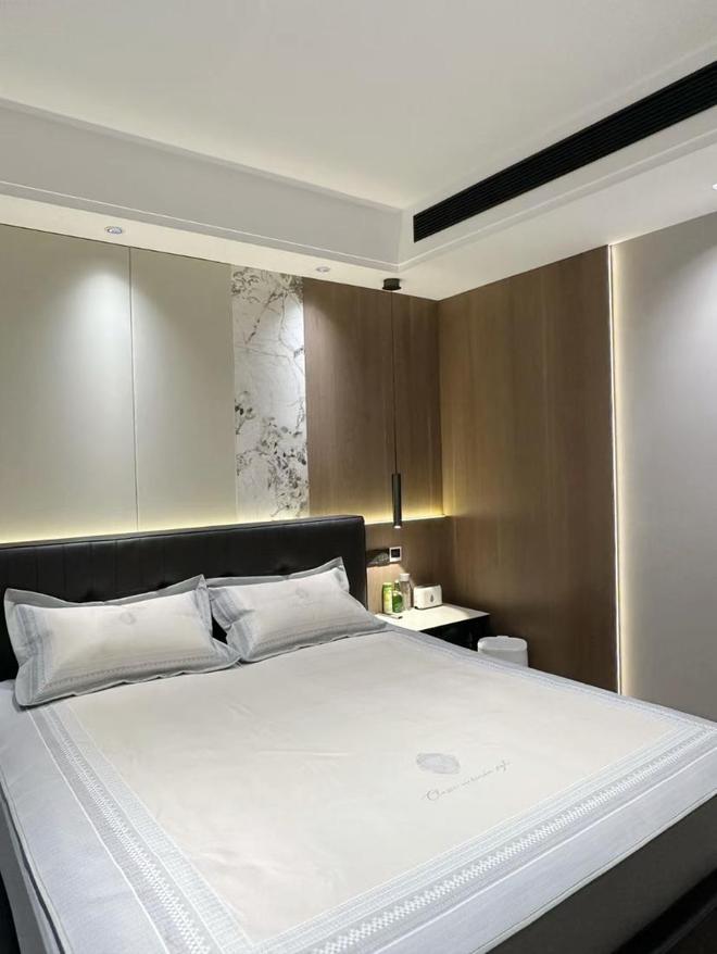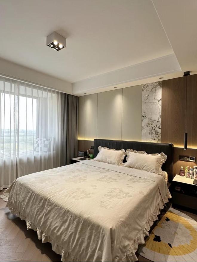 卧室的装修是女主比较喜欢的装修,没有太多的颜色,灰色的墙布,背景墙硬包➕潘多拉岩板,配上线条灯,效果还不错。