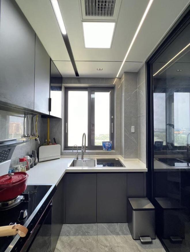 深色系的厨房是浅灰色的地面和墙面,搭配深灰色的橱柜和白色的台面,颜色简单,搭配经典。顶面增加了轨道灯和线性灯带,让厨房的顶面可以更高级。