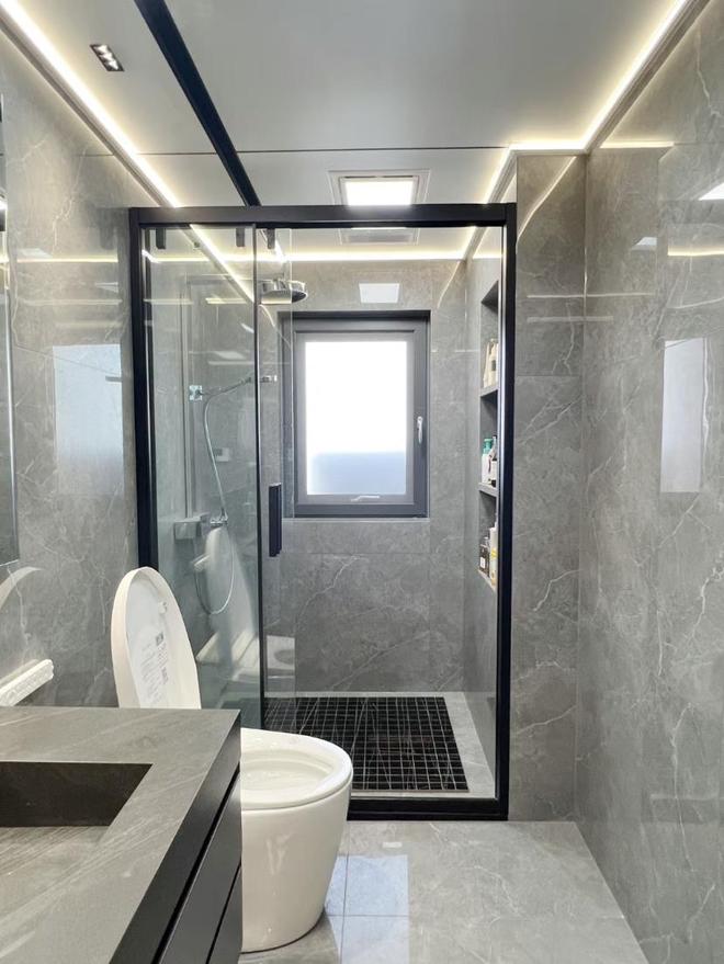 干湿分离,做了淋浴房,三联动,洗澡也不会水花溅的到处都是,淋浴房做了拉槽,做了超白玻璃推拉的款式。