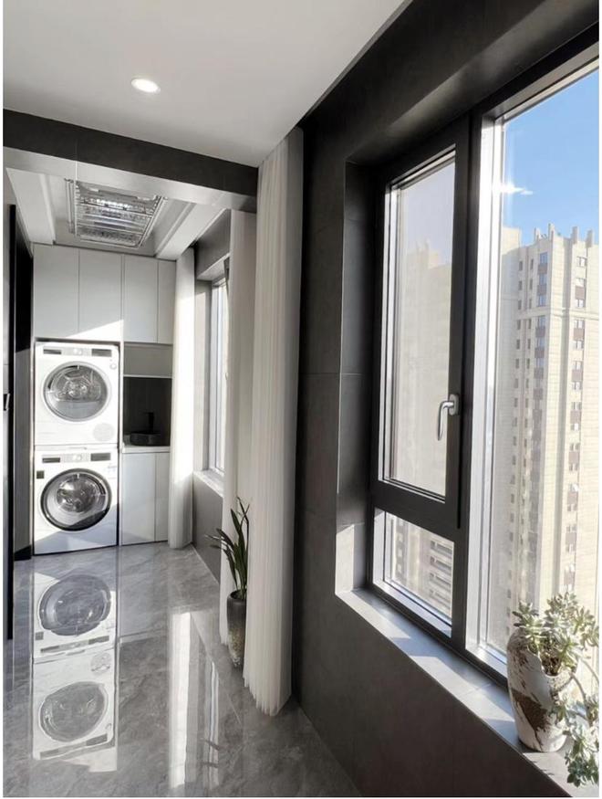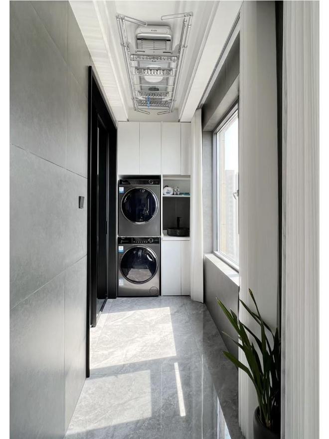 生活阳台顾名思义,主要功能是满足生活所需,顶面是可升降的晾衣杆,可以晾晒衣物和床上用品。侧端是洗衣机、烘干机和收纳柜,方便洗衣服和收纳。