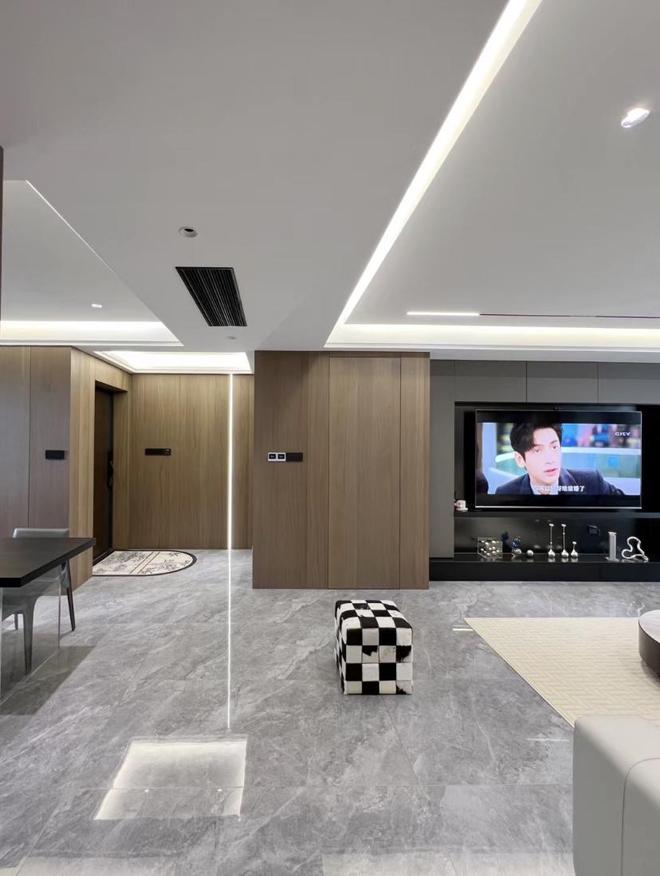 大面积的饰面板可能也会有些呆板,增加了一条线性灯带,可以让墙面灵活起来。灯带在光滑的地面形成光影,和墙面的灯带本身连接在一起,很有延伸性。