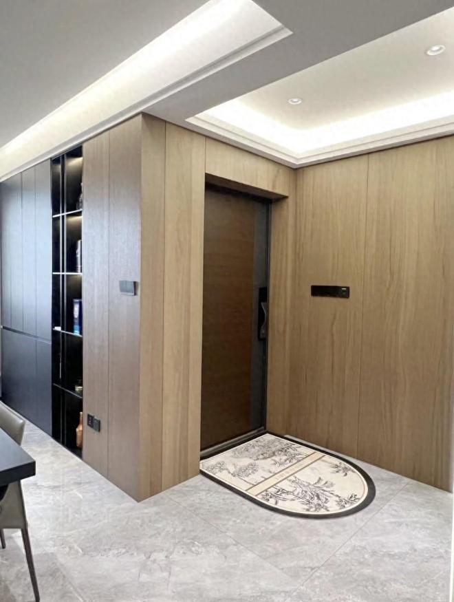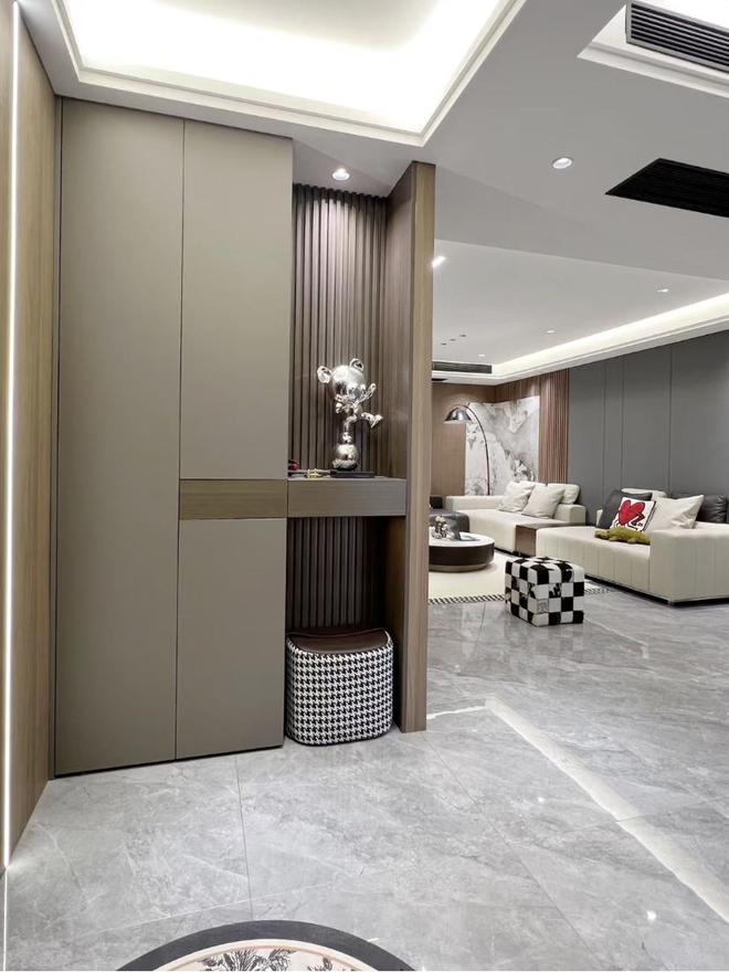 为了和墙面的饰面板形成统一,鞋柜也设计成无把手的一门到顶式,让柜门可以像饰面板一样好看。旁边的木格栅则真的只是装饰的作用,整个玄关就主打一个高级感。