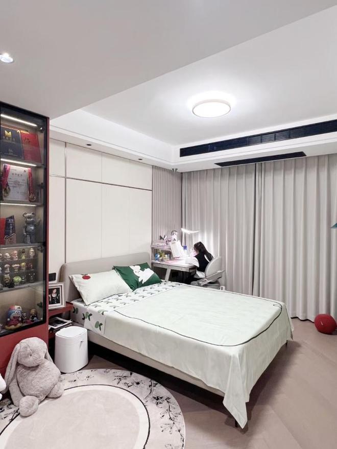 为了让女儿房能多一些的氛围感,柜子增加了荔枝红的颜色,还增加了两扇透明的玻璃门,让柜子变成房间里的一道风景线。