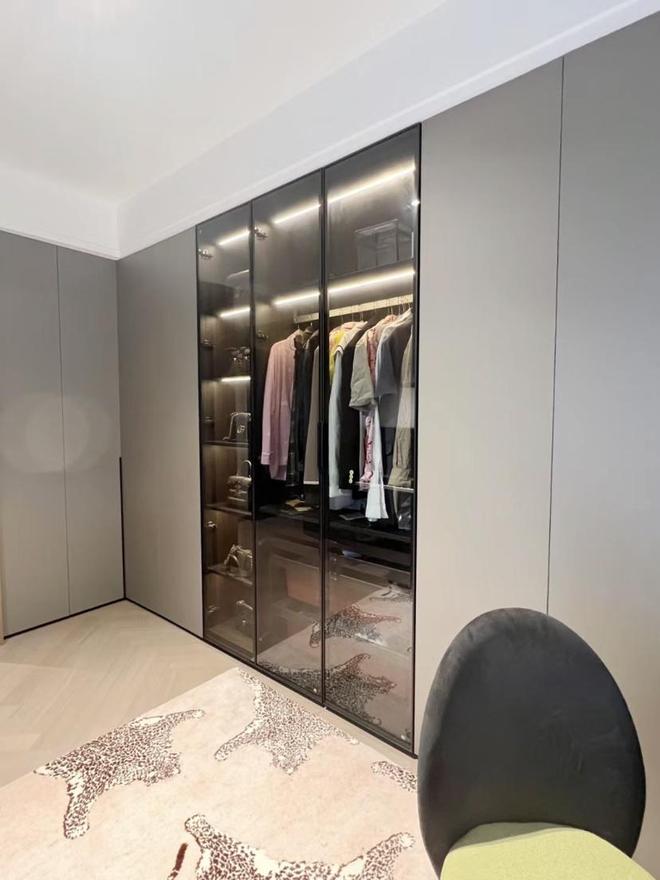 做一个横排的衣柜,加上梳妆台足够使用了,加了三扇玻璃门非常有质感,再加上一个香格里拉窗帘,更有氛围感。