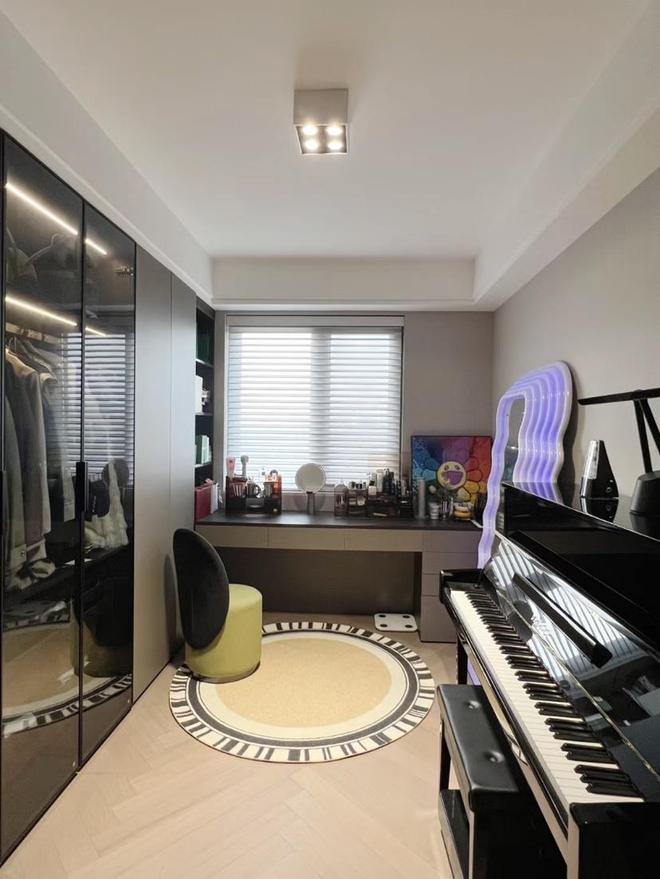 北面房间不是太大,毫不犹豫的把客房跟主卧室改成一个套房,做到主卧有卫生间,衣帽间。放上没地方放的钢琴,太完美。