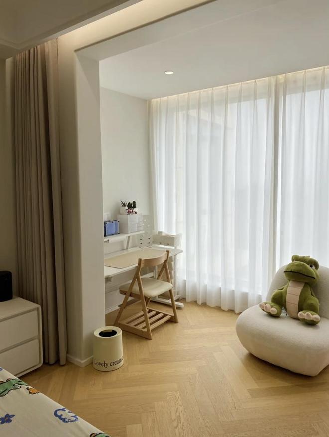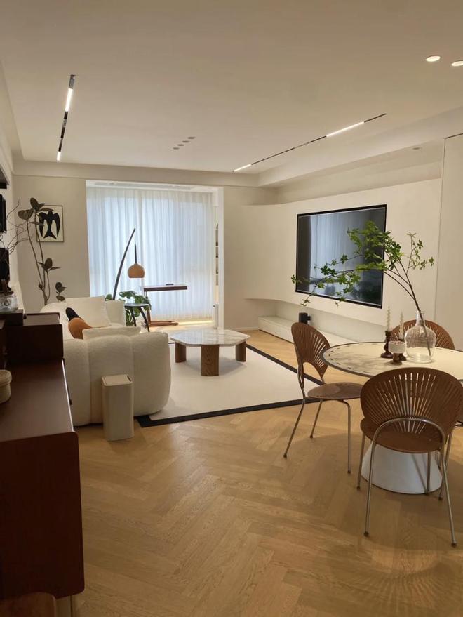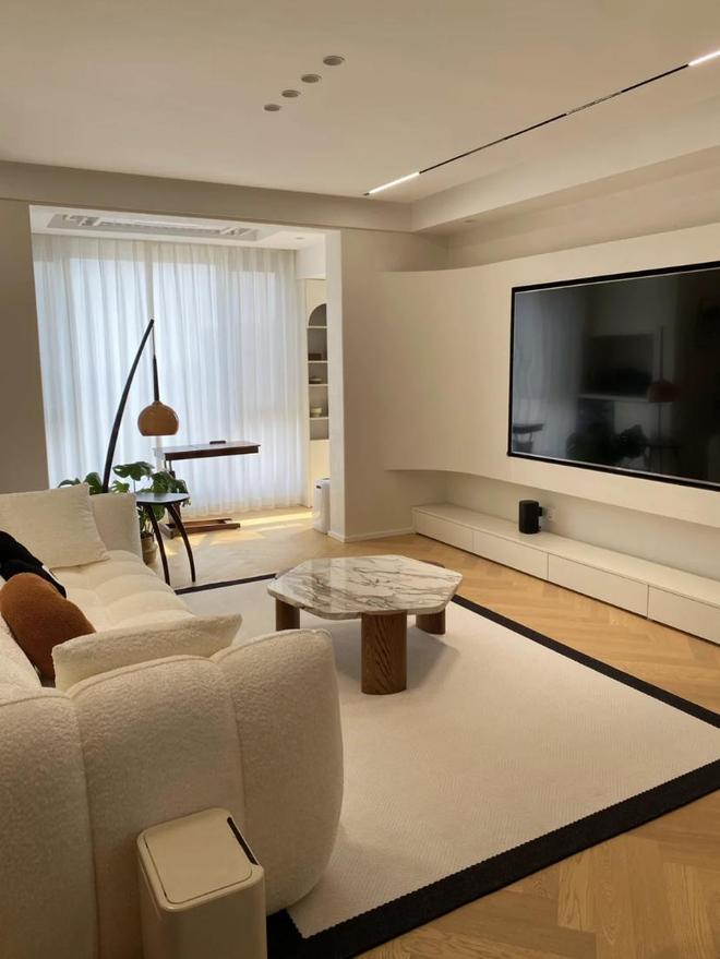 今日精选案例是来自@小桃子的新家,建筑面积139平,套内111平,四室一厅一厨两卫。全屋刷了暖白色艺术漆,通铺人字拼原木色地板,做了无主灯设计,简单耐看。客厅放了一个奶白色的沙发,像一个大大的南瓜一样,坐感也很舒服,铺上一张大大的地毯,整个家会显得很温馨。