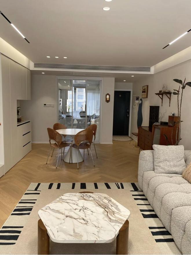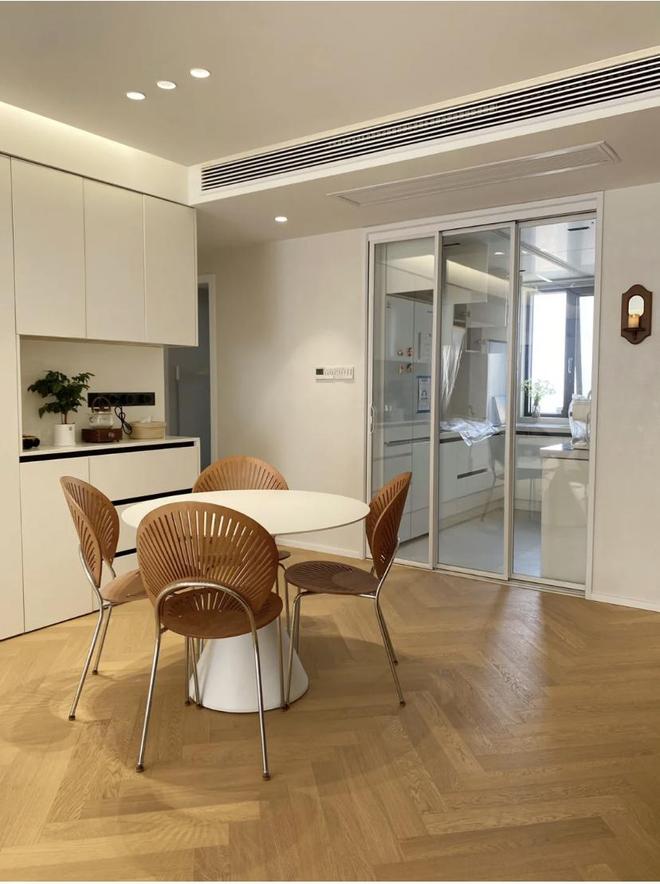 客餐厅做一体式的设计,地面是通铺的实木地板,顶面是拉通的无主灯设计。只是在餐厅旁的过道的顶面增加了中央空调,空间设计在这里,对客餐厅的影响是最小的,更实用一些。