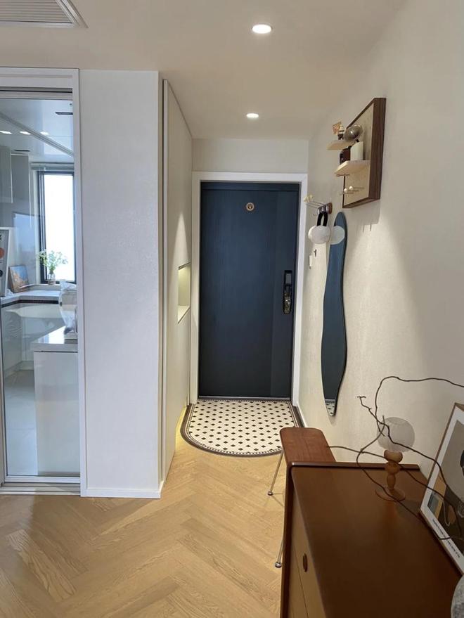 玄关的宽度是比较窄的,好在侧面的墙体是可以拆除的,拆除掉后借用墙面的厚度做了一个嵌入式的鞋柜,和墙面完美的融为一体,实用又美观。