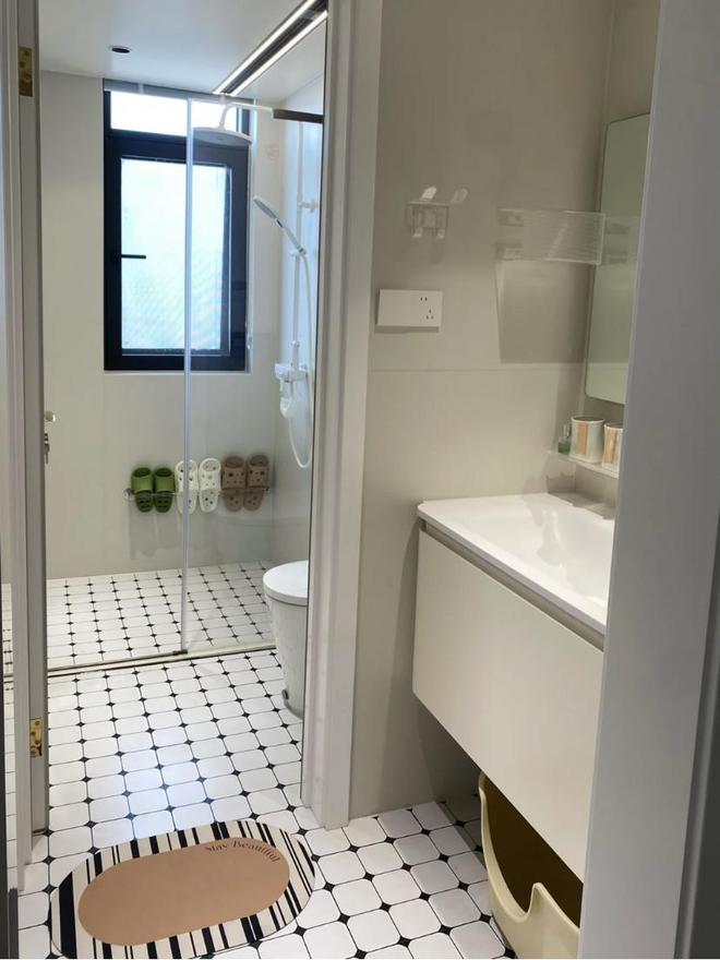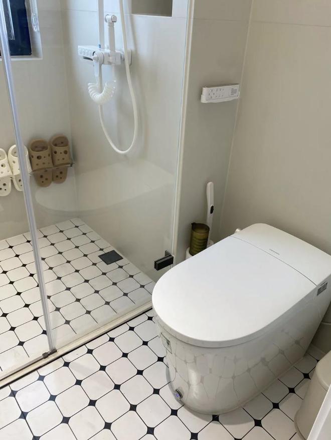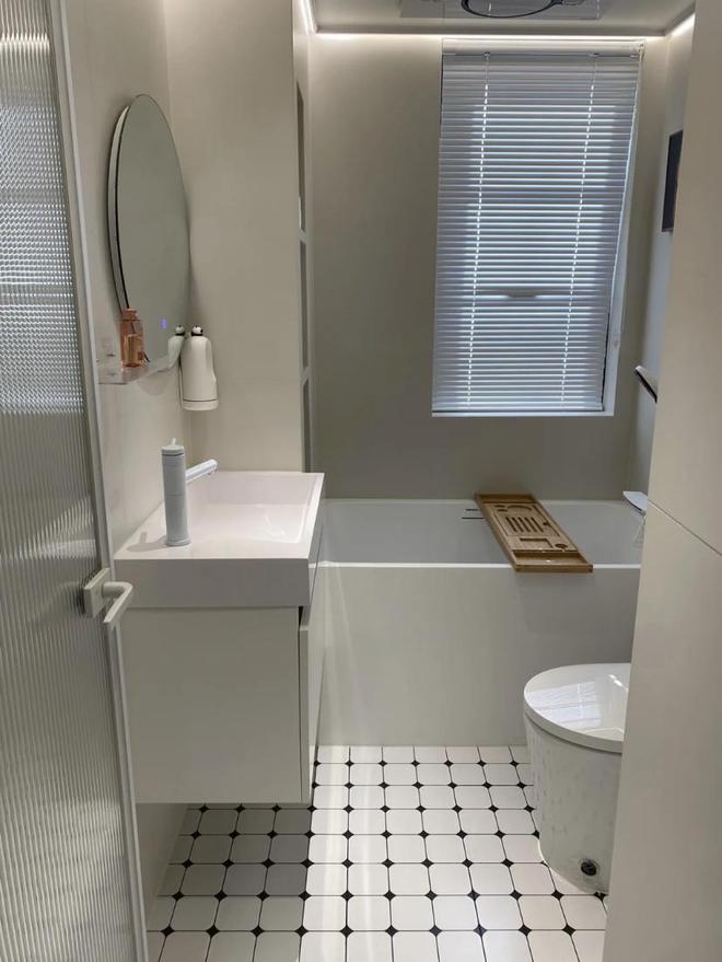 整个卫生间贴了奶白色哑光砖,地面铺了黑白色小方砖做点缀。装了智能马桶,不仅好用颜值也很高,每天上厕所都很开心。浴室里也装了同色系的奶白色花洒,整个浴室都是奶油色的,爱了。