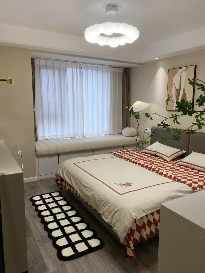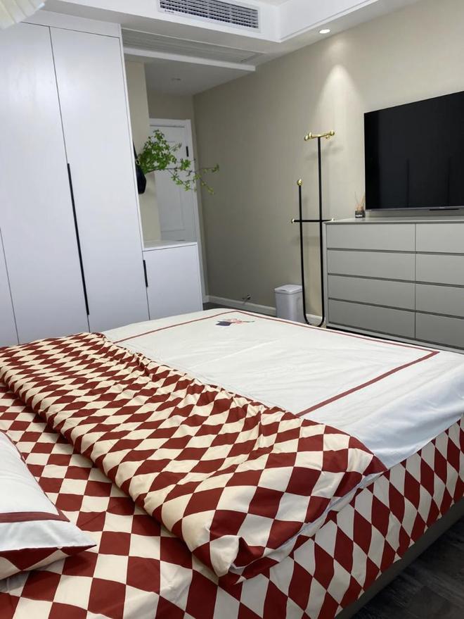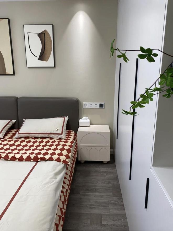 斗柜尺寸150cm宽度40cm,平日里用来收纳家里的小物件袜子内衣啥的,梳妆台尺寸80cm,日常护肤化妆也是完全够了。除去放了柜子的位置,床尾的空间还有80公分,平时两个人走路也很宽敞,不会拥挤。