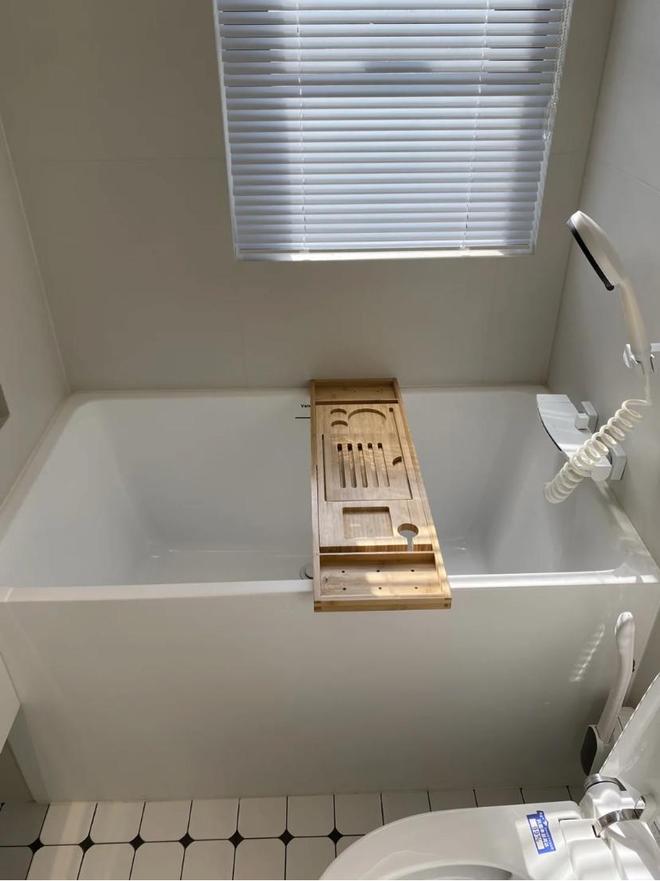 不到4个平方,真的是很小了,不过麻雀虽小,五脏俱全,靠窗位置放了最喜欢的浴缸,亚克力的材质易清洁不易发黄 尺寸1.2米严丝合缝正好贴在这个位置,效果一下就有了。