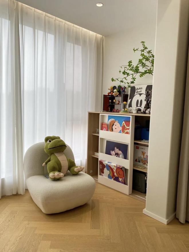 阳台的这一侧被布置成一个阅读角,摆放上孩子喜欢的绘本、读物,坐在小沙发上就可以看了。在这里,孩子可以安静的坐好一会儿,简直是个解放父母的角落。