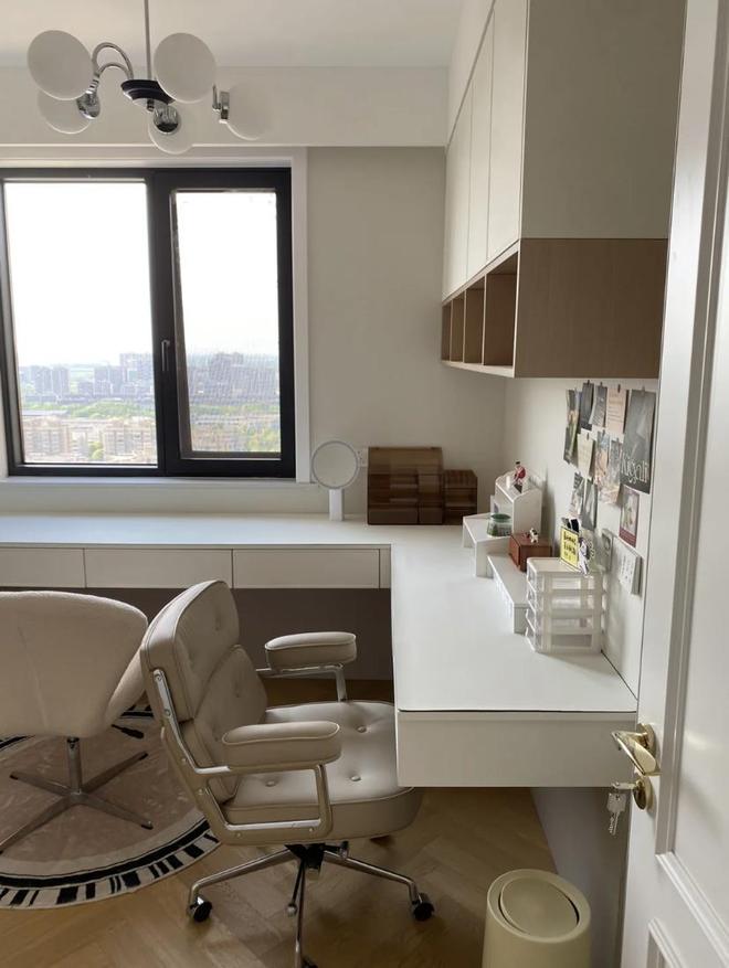 在进门前方的位置也做了一个拐角书桌,上方做吊柜,这样既不浪费空间,也有足够的地方同时容纳女主和家属一起办公。