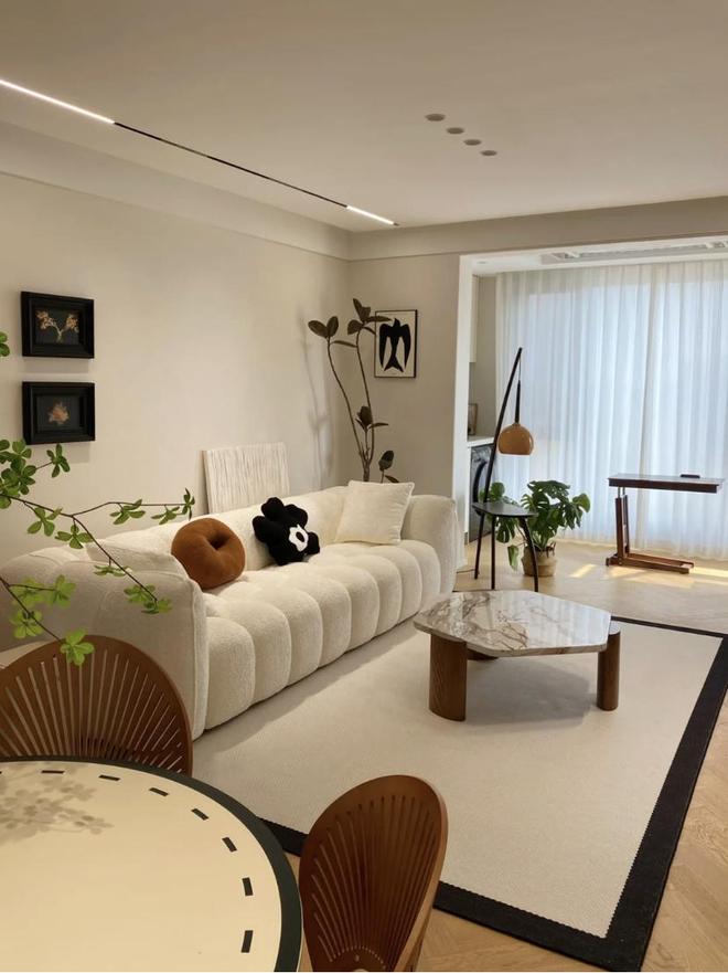 软乎乎的毛毛虫沙发本身就是一个很不错的装饰物品,眼尖的朋友们可以看出前期客厅的沙发其实是灰色的,现在换成了白色,奶呼呼的,给人更多一些的温馨感。