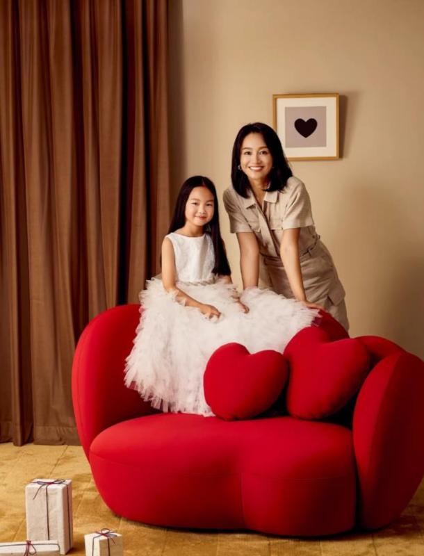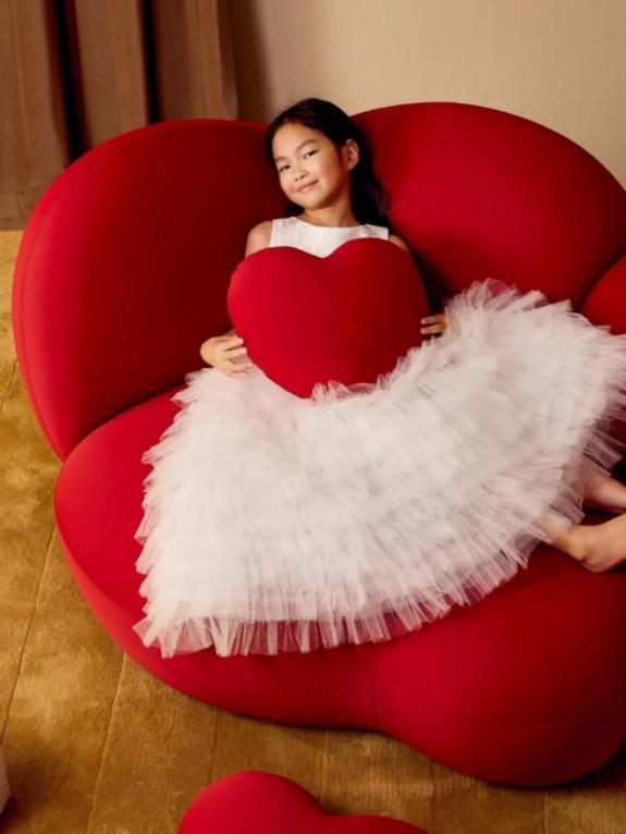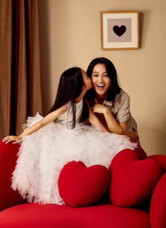 照片里,母女俩坐在一张特抢眼的红色爱心沙发上,女儿穿着白色的公主裙,亲她妈妈的脸,那个画面,真的挺暖的,朱丹那个笑,有点夸张,但你能看出来,那不是演的,是发自内心的开心。