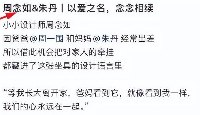 后来才知道,这张沙发,竟然是8岁的周念如自己设计的,这就有点厉害了,一个8岁的小孩,都开始当设计师了,她说,因为爸爸妈妈老出差,所以她就想把对家人的那种牵挂,都藏到这张沙发里。你仔细看那个沙发,好像是四个爱心拼起来的,这不就是他们一家四口嘛,她和弟弟,还有朱丹和周一围,这孩子,也太贴心了吧,心里想的事儿还挺多。
